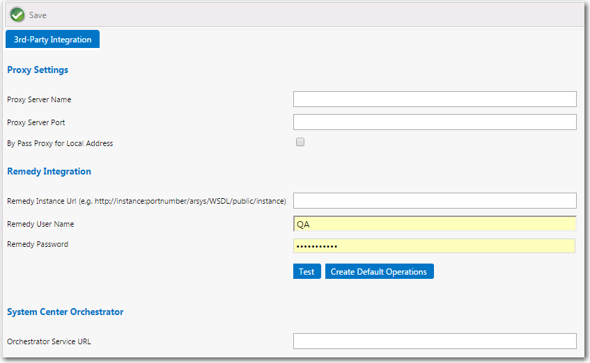 To integrate App Portal with Service Now or BMC Remedy, you first need to open the Site Management > Settings > ServiceNow Integration or 3rd-Party Integration view and provide the URLs to the relevant web services along with the credentials required to create both incidents and requests on these systems.