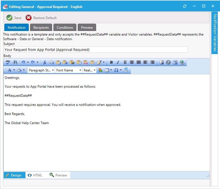 5. To insert a variable into the email, click on the Notification Variables button on the right side of the dialog box to open the Notification Variables dialog box, select a variable from the list, and click Add .
