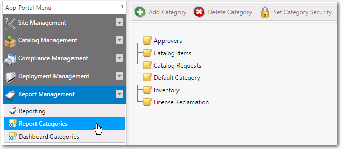 2. Under Report Management , select Report Categories . Existing categories are listed in the right pane.