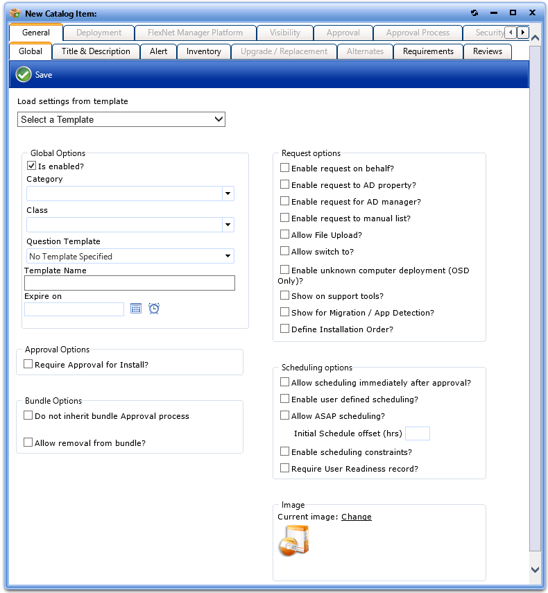 2. Under Create New Catalog Item , click on New Software Catalog Item . The General > Global tab of the New Catalog Item Properties dialog box opens.