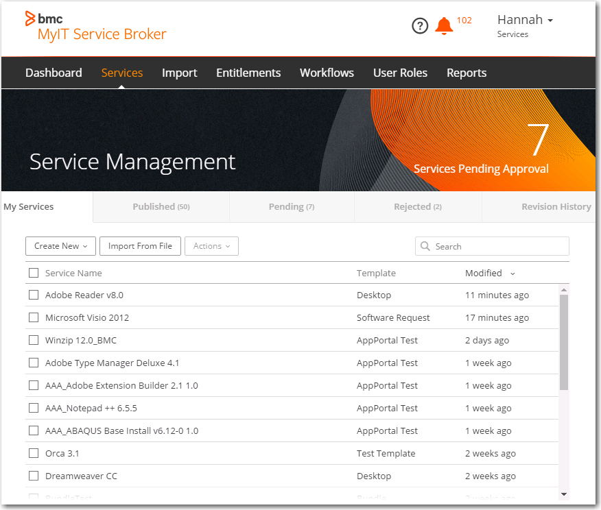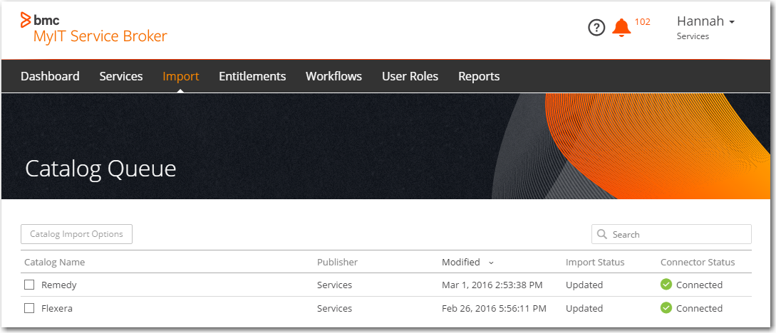 - Click Queue for Import and observe that the status of the selected catalog item will be updated to Queued . Catalog items are imported from App Portal into BMC MyIT. Queue for import means that the catalog items are ready to be imported into BMC.