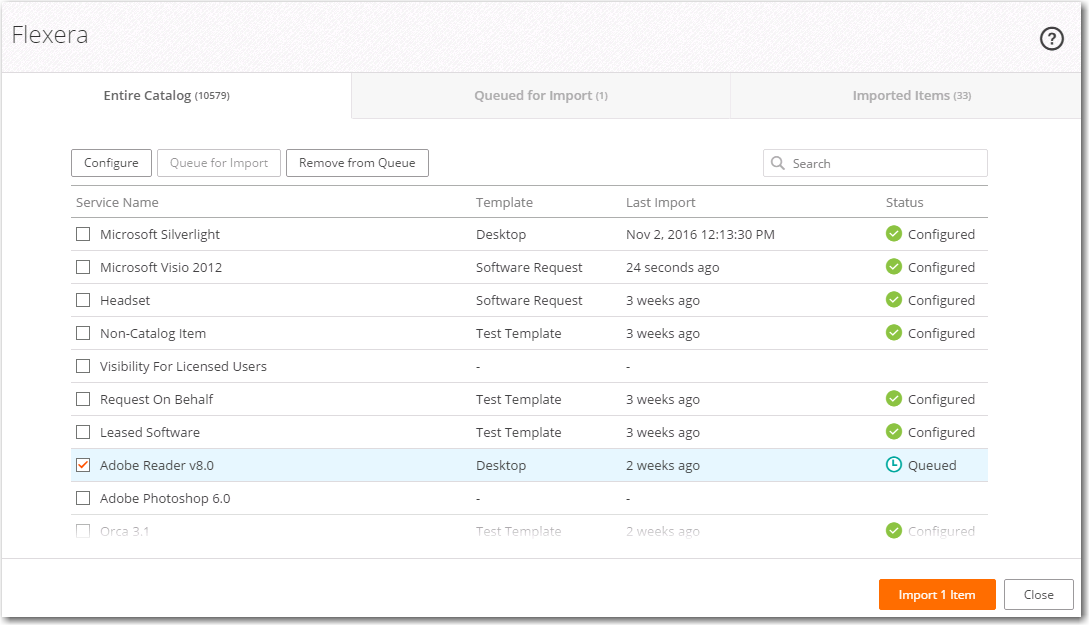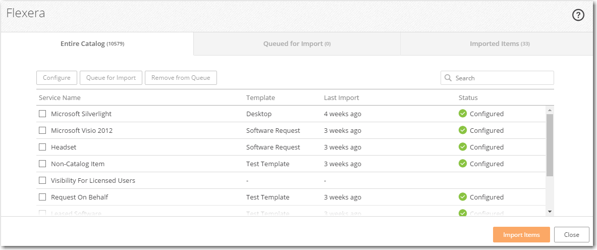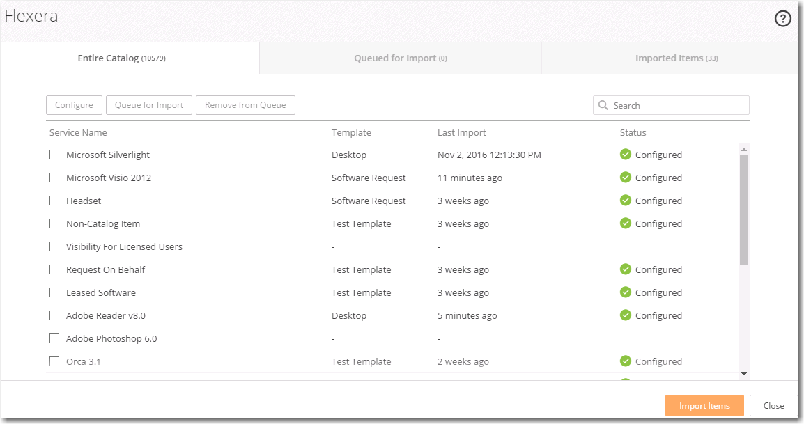 - Double click on Flexera . The Entire Catalog tab of the Flexera page opens, and the Last Import column of the catalog item lists the time period since the import (such as 5 minutes) and the Status column is changed to Configured .