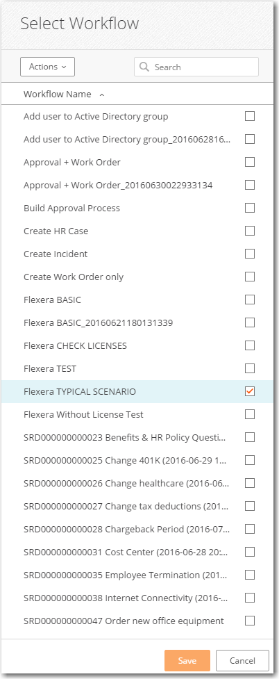 - Select a workflow, such as Flexera TYPICAL SCENARIO , and click Save .
