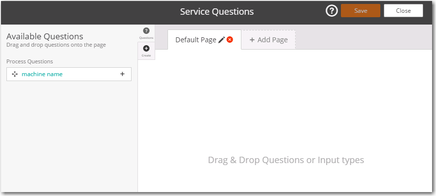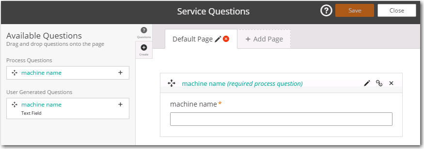 - Click Save to close the Question Settings view. The Service Questions view opens, displaying the machine name field.