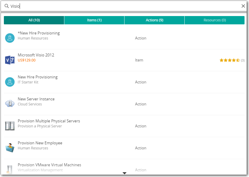 - Search for the published services (catalog items) by entering text in the Search text box. A list of search results appears in a pop-up dialog box: