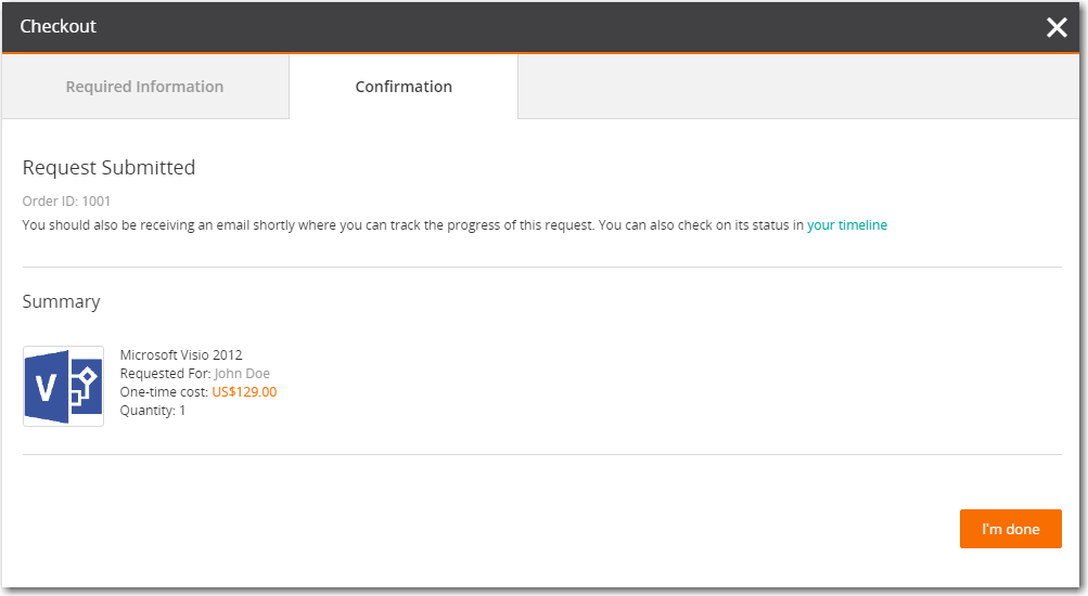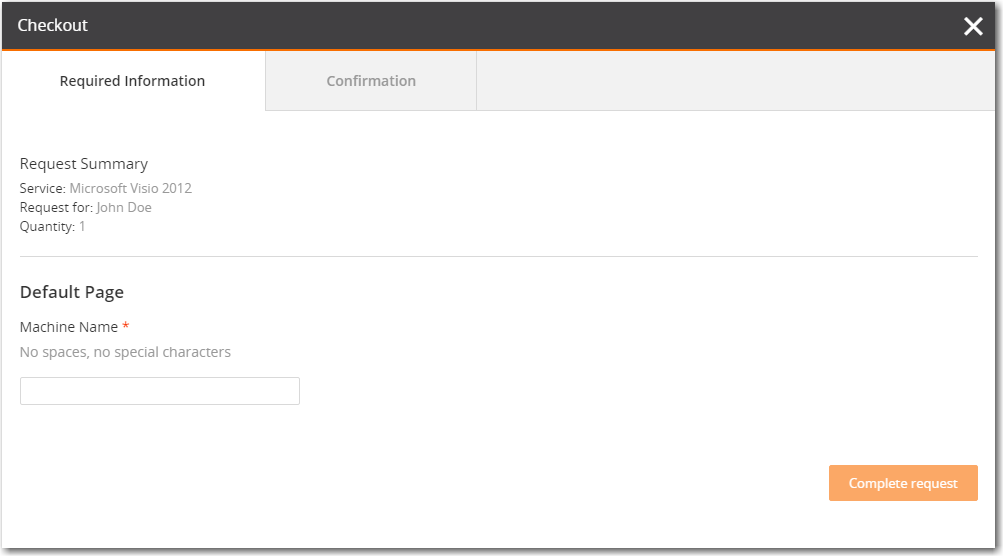 - Enter the Machine Name and click on the Complete request button. The Confirmation tab of the Checkout process opens and the Request Submitted message is displayed.