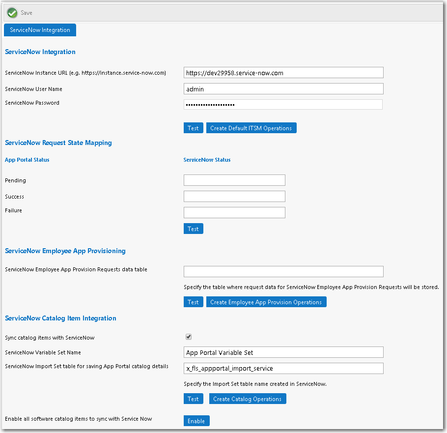 1. Under ServiceNow Integration , click Test . App Broker will connect to that instance of ServiceNow and will obtain integration settings.