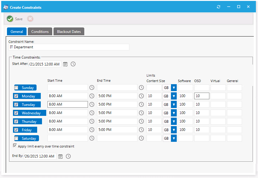 Type Limits: Software, OSD, Virtual, and GeneralUse to limit the volume of the specific class of catalog item (software, OS deployment, virtual package, or general) that can be requested. This allows you to limit by the type instead of limiting the time or data size.