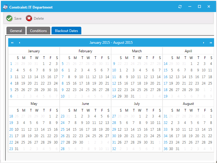 1. Open the Blackout Dates tab. Use blackout dates to limit scheduling options such as holidays. The requester will not be able to select a date from the scheduler if it is blacked out.
